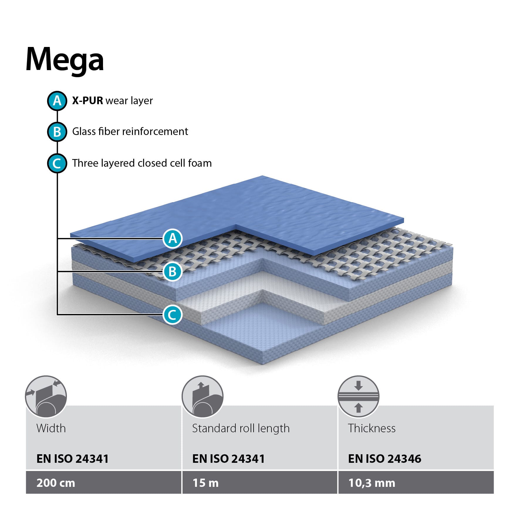 Mega هو حماية قصوى للمفاصل X-PUR سطح سماكة 10.3 مم بفضل امتصاص الصدمات الممتاز، توفر هذه الأرضية وظيفة حماية قصوى للمفاصل.