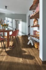 كما يتميز هذا الباركيه بطبقة طلاء مطفي فائق (Ultra Matt) تتغلغل داخل مسام الخشب، مما يمنحه مظهرًا طبيعيًا راقيًا، إلى جانب سهولة في التنظيف ومقاومة عالية للبقع والخدوش الدقيقة.