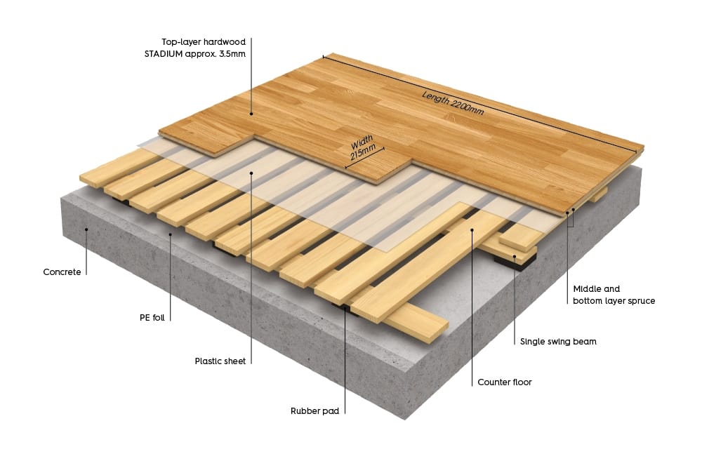 Singleflex Stadium من مجموعة أرضيات BOEN الرياضية – نظام Singleflex هو عندما يكون فرق المناسيب أو ارتفاع الأرضية تحديًا في المشروع، فإن Singleflex يقدم الحل المثالي للتسوية مع الحفاظ على الأداء الرياضي العالي.