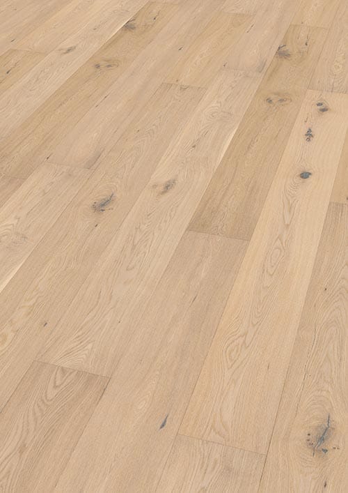 - أرضيات كلاسيكية من لوح واحد بسماكة 14 مم، مع طبقة علوية من خشب البلوط بسماكة تقريبية 3 مم.